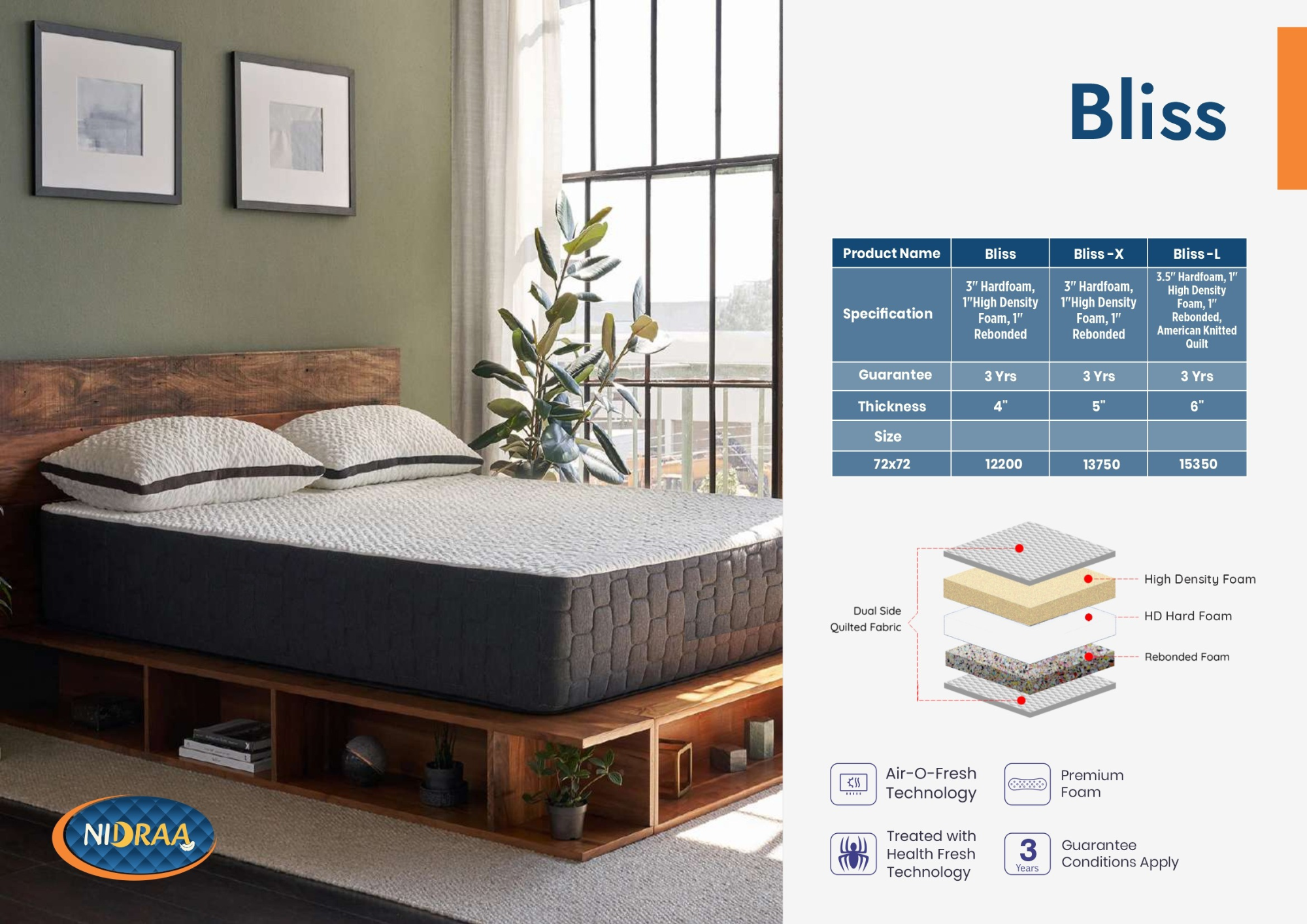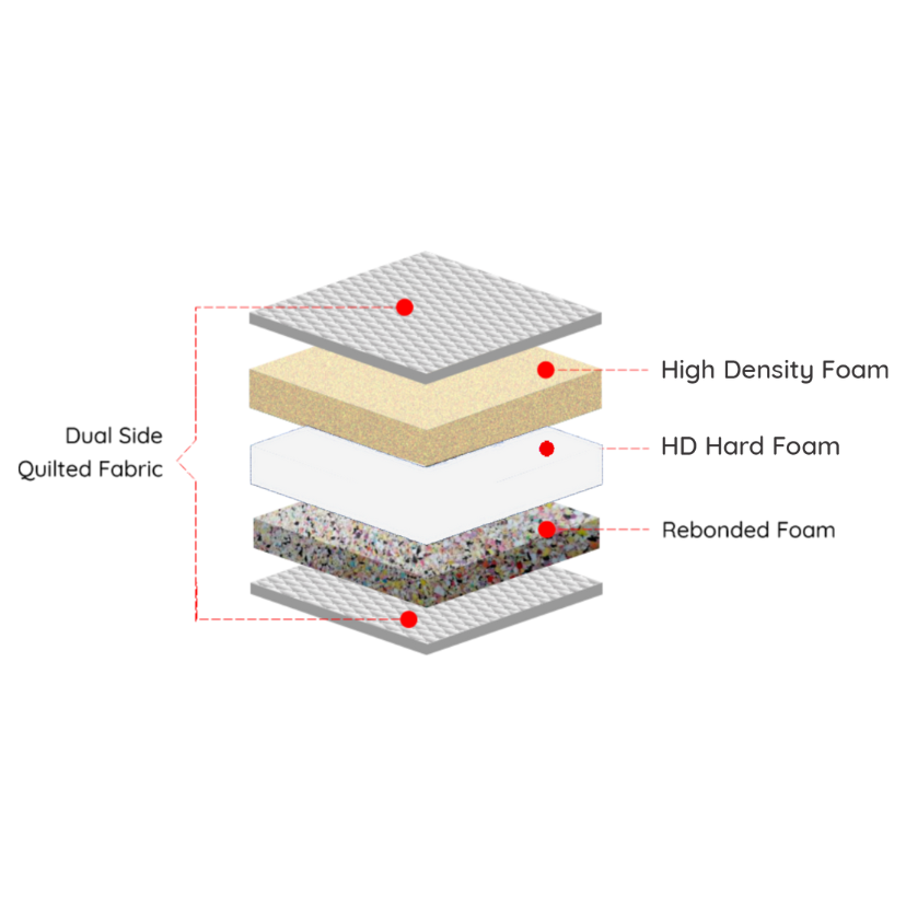 The Bliss Mattress is designed with a unique blend of Hardfoam, high-density PU foam, and rebonded foam, providing the perfect balance of softness and support. Its satin lycra quilted cover adds a smooth, breathable feel, making it lightweight, durable, and ideal for everyday comfort.
